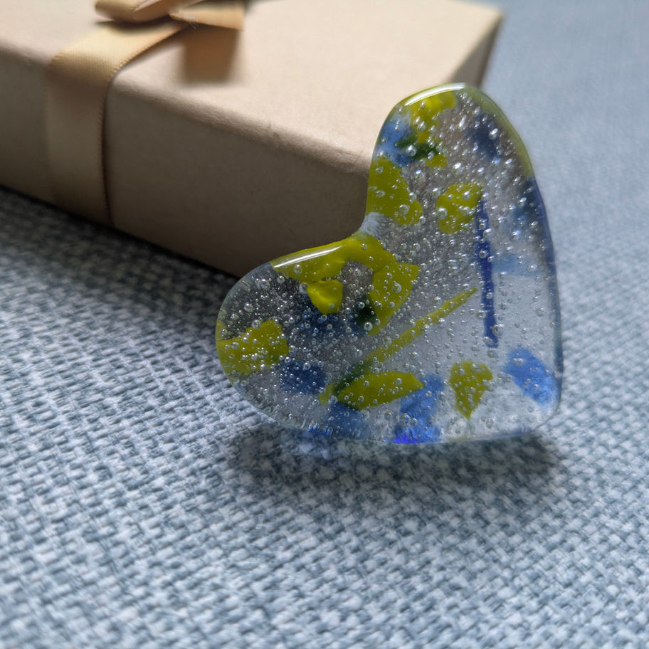 A small, tactile fused glass heart designed for mindfulness, wellbeing, and gentle moments of calm. Perfect as a pocket keepsake, a gift, or a desk companion to encourage relaxation and self-care.